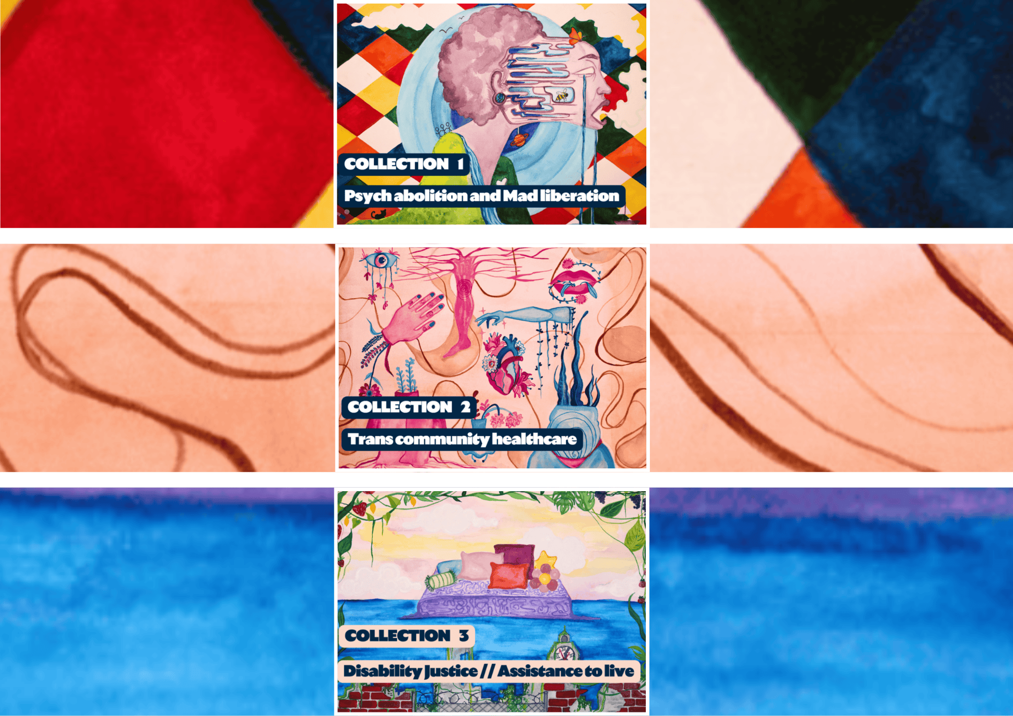 I commissioned creative works in two rounds: the first was a selection of individual pieces that spoke to any of the themes, with an open and flexible approach. Then, I launched three specific collections around particular themes and commissioned work relating to each: psychiatric abolition and Mad liberation, trans community healthcare, and disability justice.