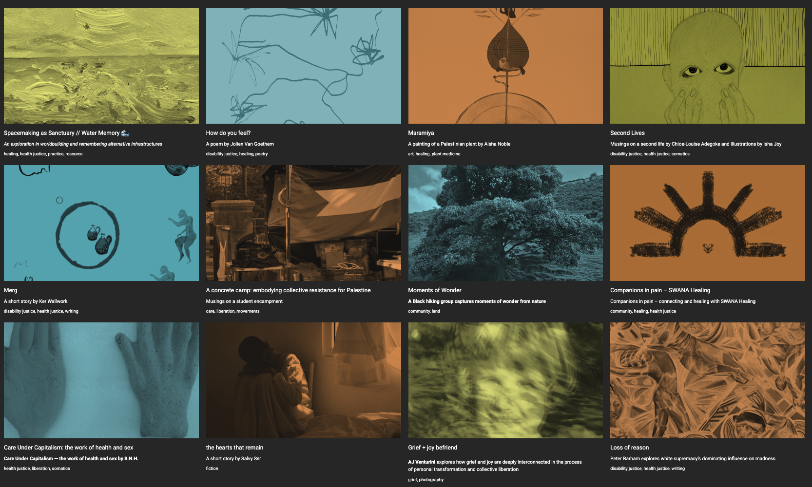 As the inaugural Editorial Steward, I helped envision and build the platform from scratch. I then commissioned creative works that directly engaged with and responded to key themes in HJLs work, including disability justice, grief work, survivor work, politicised somatics, community-led research, abolition, and themes in and around these. Work could take the form of writing, art, audio, video, and multi-media projects.